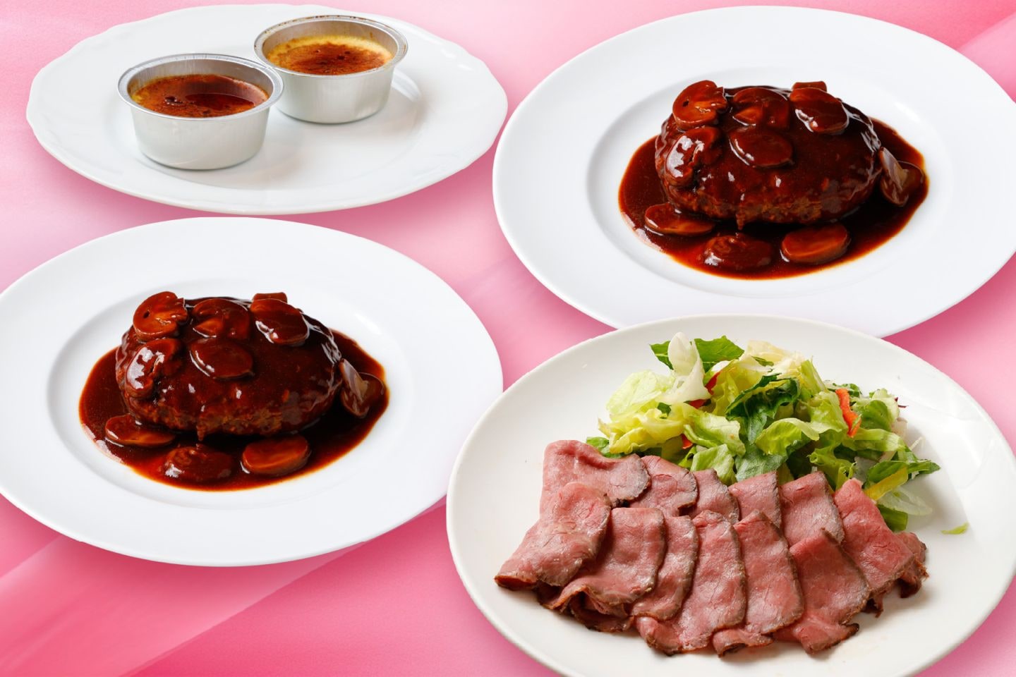 ハンバーグ【食肉[牛肉(国産)、豚肉(国産)]、たまねぎ(国産)、牛脂(国産)、つなぎ(パン粉、液卵白、卵白粉)、ゼラチン、食塩、果実調味料(梅酢、食塩、発酵調味料)、香辛料、植物油脂 / pH調整剤】、 ソース【デミグラスソース(トマトペースト、なたね油、その他)(国内製造)、マッシュルーム水煮(マッシュルーム、食塩)、ぶどう酢、はちみつ、赤ワイン、ビーフコンソメ、しょうゆ、ナツメグ/増粘剤(加工でん粉)、着色料(カラメル)、調味料(アミノ酸等)、乳化剤、香料、pH調整剤、酸化防止剤(V.C、亜硫酸塩)、酸味料、酒精】、(一部に乳成分・小麦・卵・牛肉・大豆・豚肉・ゼラチンを含む)