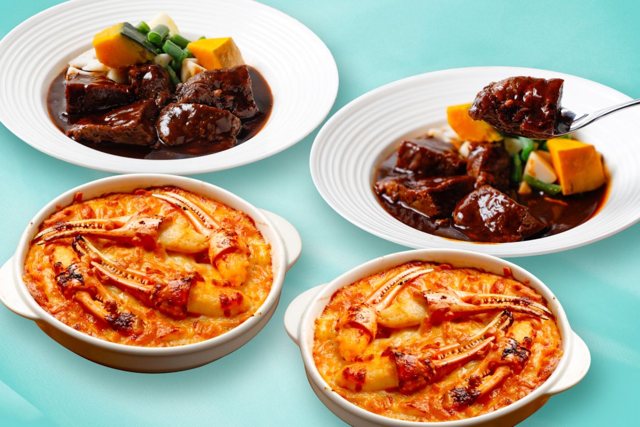 牛乳(国内製造)、紅ずわいがに、ペンネ(デュラム小麦のセモリナ)、紅ずわいがに加工品(紅ずわいがに、食塩)、ナチュラルチーズ(生乳、食塩)、アメリケーヌソース【ロブスターヘッド、トマト加工品、野菜(タマネギ、ニンジン、セロリ、ニンニク)、白ワイン、植物油脂、ブランデー、バター、小麦粉、食塩、香辛料】、バター、薄力粉、フォンドオマール、食塩、オニオンソテー、食用なたね油、オリーブ油、白ワイン、チキンコンソメ、グラニュー糖、こしょう/安定剤(セルロース)、炭酸Mg、酸化防止剤(亜硫酸塩)、調味料(アミノ酸等)、着色料(カラメル)、酸味料、シリコーン、(一部に乳成分・かに・えび・小麦・大豆・鶏肉を含む)